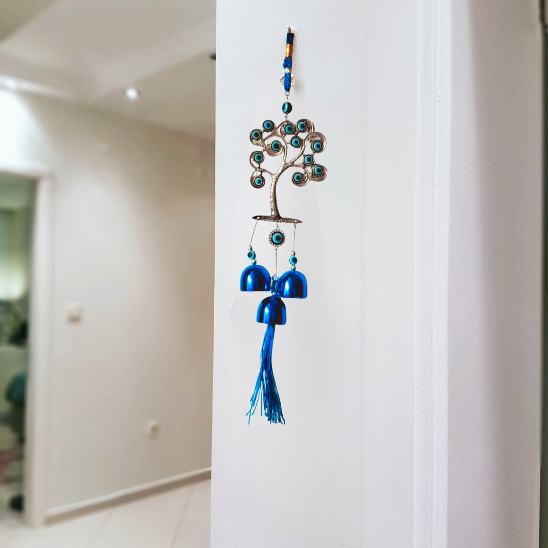 ✔ Elegant Tree Design – Detailed tree structure adorned with blue Evil Eye charms and bells.