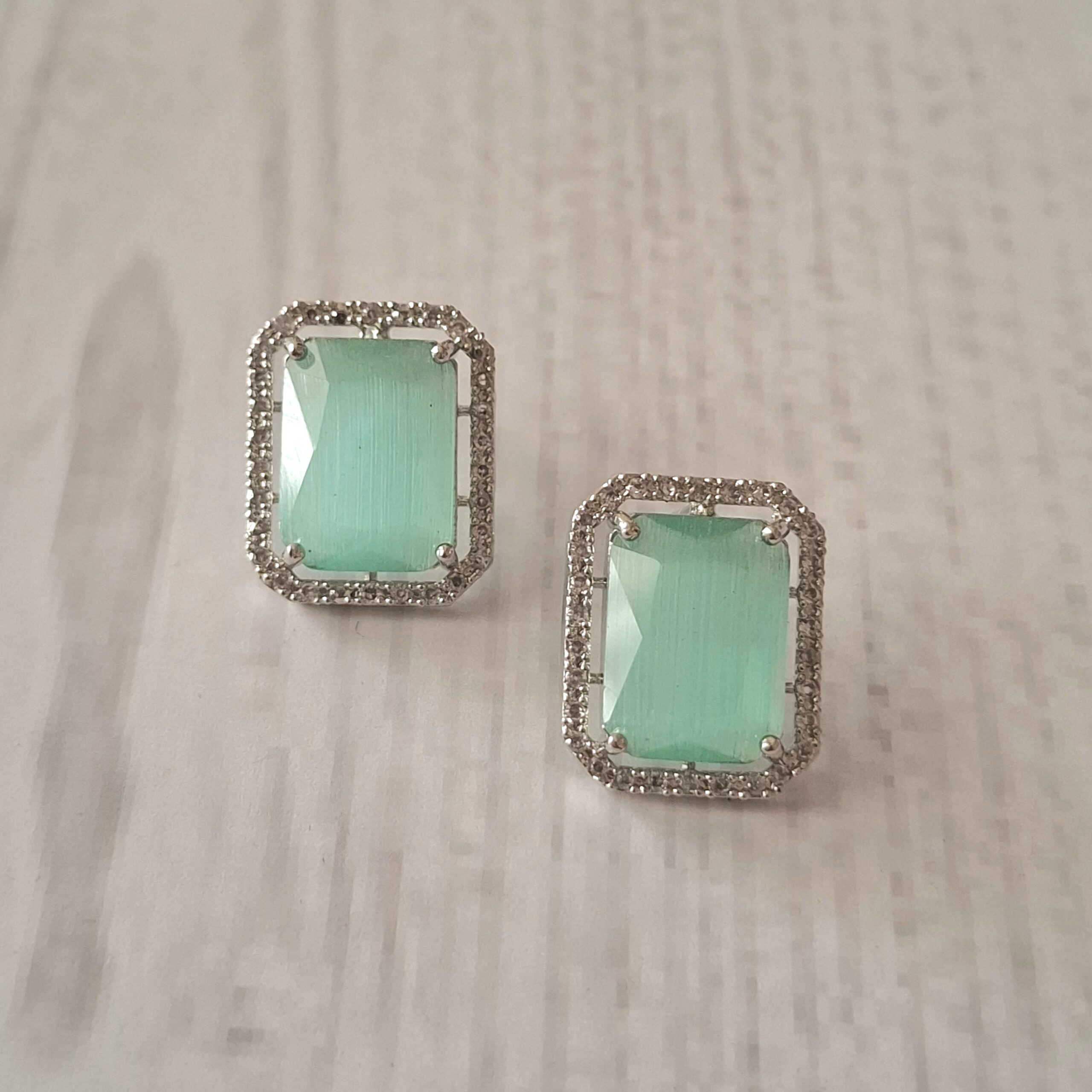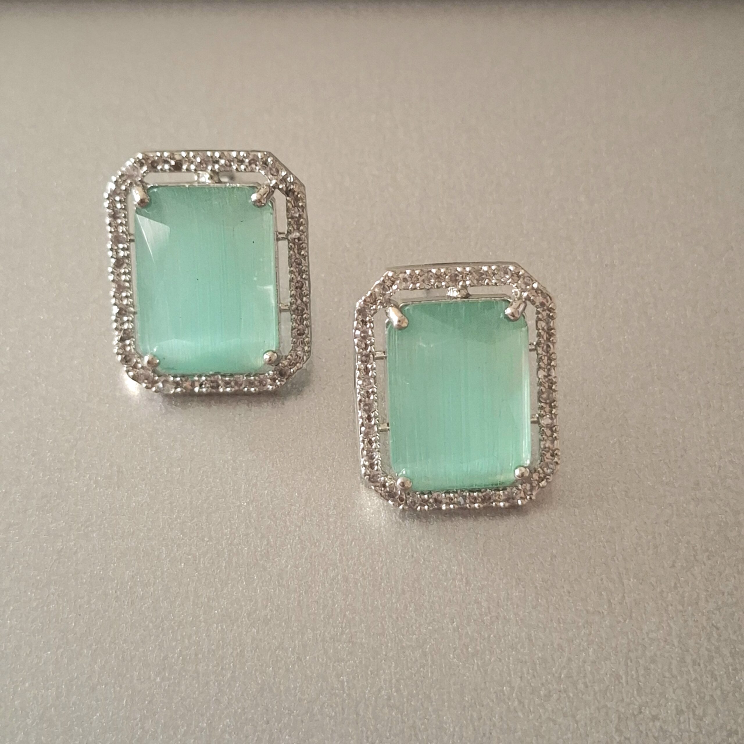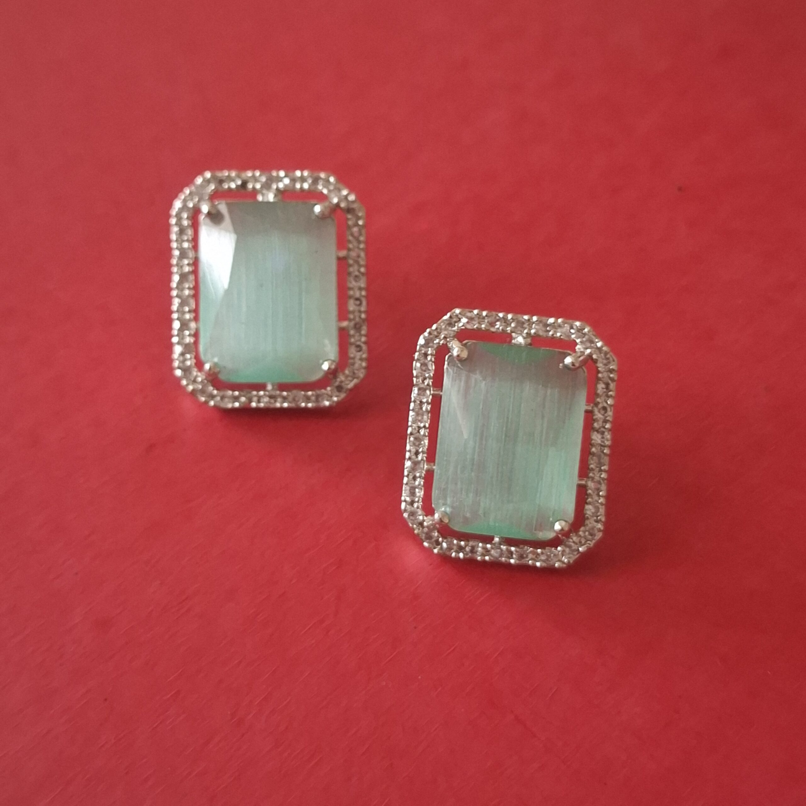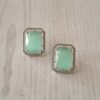 Shine with Pearls And Palettes’ Chic Rectangular Aqua Stone Stud Earrings. Featuring vibrant rectangular aqua stones surrounded by sparkling American diamonds, these earrings add a fresh and stylish touch to any outfit. Perfect for parties, casual outings, or daily wear, they effortlessly combine elegance with modern charm.