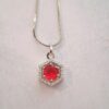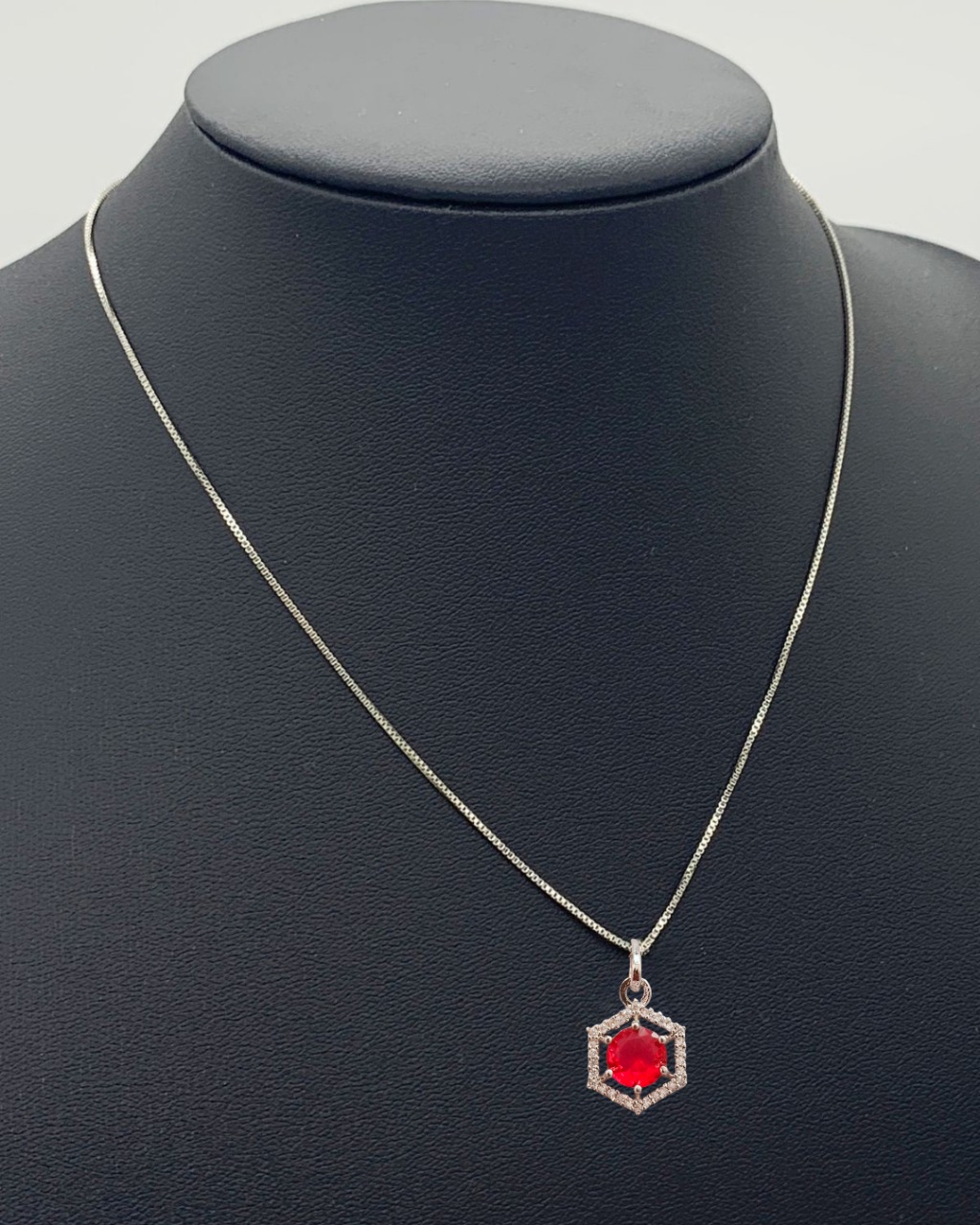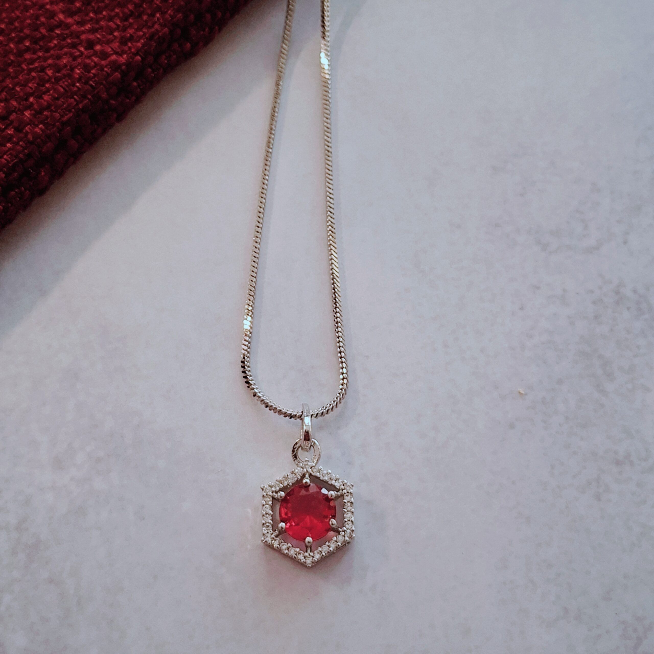 Enhance your jewellery collection with Pearls And Palettes’ Elegant Hexagon-Shaped Halo Ruby Crystal Pendant. This stunning piece features a radiant ruby-red gemstone at the centre, beautifully framed by a sparkling hexagon halo of American Diamonds that adds a modern yet luxurious touch.